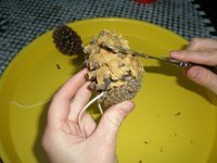 4. Spread peanut butter all over and inside the pine cone, leaving the top as clean as you can.