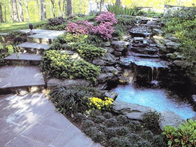 The sound of water trickeling in a brook or pouring over a waterfall, water always brings drama to a garden.